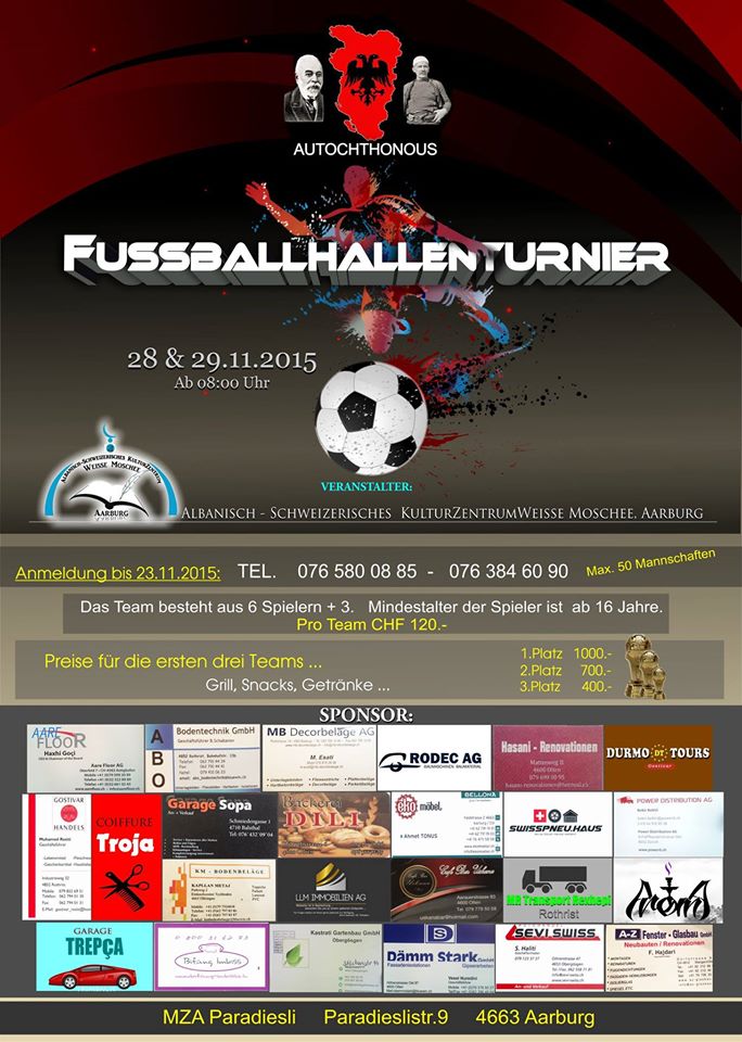 Xhamia Aarburg organizon turnir me rastin e 28 Nentorit Publikuar me: 5 Nentor, 2015 Vegëza shtesë Lajme Lajme nga bota Islame(155) Lajme nga Zvicra(256) Lajme rreth Unionit(203) Artikuj Fetarë Ahlak(12) Akideh(9) Analiza(25) Fikh(55) Histori islame(15) Sociale-Filozofike(17) Të ndryshme(61) Artikujt relevantTribunë fetare në xhaminë shqiptare të Reinach-utMarch 13, 2018Urim me rastin e 7 Marsit, ditës së MësuesitMarch 7, 201850 nxënës nga Gjimnazi kantonal i St. Gallenit vizituan xhaminë El-HidajeMarch 7, 2018Xhamia El-Hidaje në St.Gallen shënoi 26 vjetorin e themelimit të sajMarch 1, 2018Seminar me imamë për përllogaritjen e kalendarit lunarFebruary 28, 2018Kryetari i UBISHZ vizitoi xhaminë “Sabër” në qytetin e WinterthuritFebruary 19, 2018