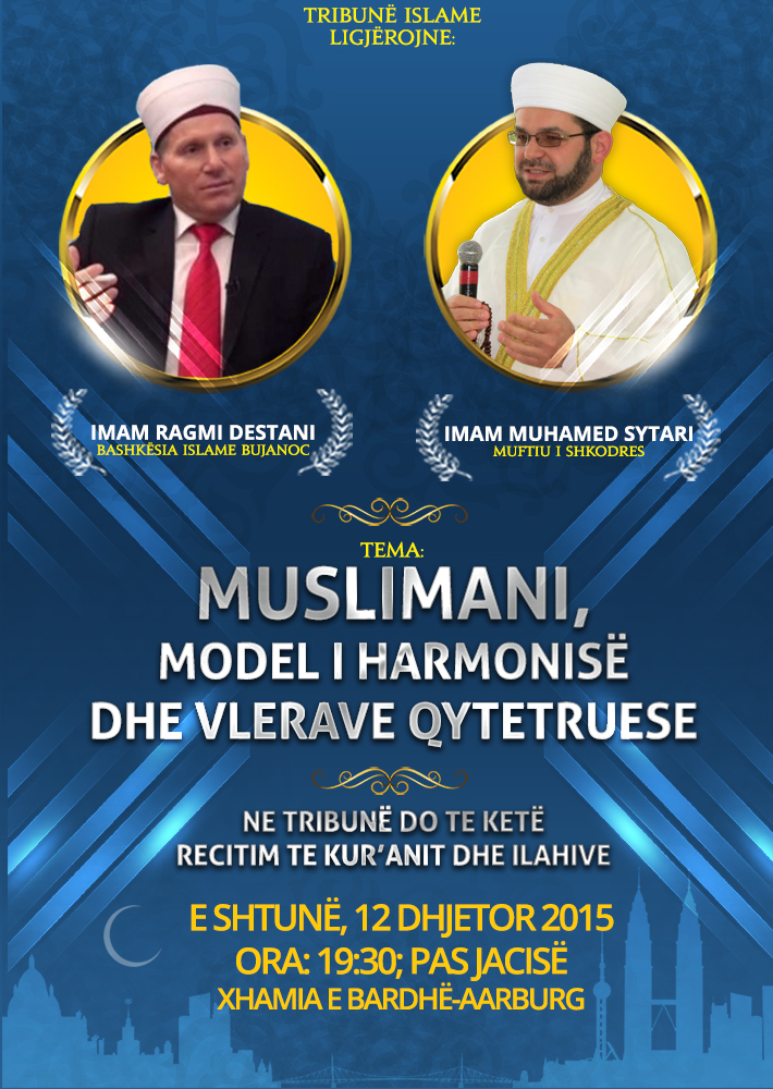 Tribune Islame “Muslimani, model i harmonise dhe vlerave qytetruese” Publikuar me: 3 Dhjetor, 2015 Vegëza shtesë Lajme Lajme nga bota Islame(155) Lajme nga Zvicra(256) Lajme rreth Unionit(203) Artikuj Fetarë Ahlak(12) Akideh(9) Analiza(25) Fikh(55) Histori islame(15) Sociale-Filozofike(17) Të ndryshme(61) Artikujt relevantTribunë fetare në xhaminë shqiptare të Reinach-utMarch 13, 2018Urim me rastin e 7 Marsit, ditës së MësuesitMarch 7, 201850 nxënës nga Gjimnazi kantonal i St. Gallenit vizituan xhaminë El-HidajeMarch 7, 2018Xhamia El-Hidaje në St.Gallen shënoi 26 vjetorin e themelimit të sajMarch 1, 2018Seminar me imamë për përllogaritjen e kalendarit lunarFebruary 28, 2018Kryetari i UBISHZ vizitoi xhaminë “Sabër” në qytetin e WinterthuritFebruary 19, 2018